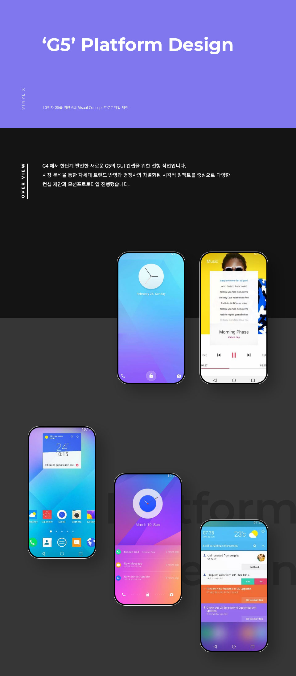Summary. G4에서 한단계 발전한 새로운 G5의 GUI 컨셉을 위한 선행작업으로, 시장분석을 통한 차세대 트랜드 반영과 경쟁사의 차별화된 시각적 임팩드를 중심으로 LG전자 G5를 위한 GUI Visual Concept 프로토타입을 진행하였습니다. PROJECT DETAILS CLIENT LG전자 YEAR 2020 TAGS Digital Transformation, Platform Design VISIT Related Works. DREAMPLUS UIUX MEMBERSHIP Open Innovation 101PACKERS Company Building 101EXPERIENCE Company Building HD HYUNDAI INFRACORE DEVELON Online Store Digital Transformation Digital Donation Service Digital Transformation LLOYD Digital Transformation TURN BAG Digital Transformation Idol Official Lightstick Entertainment Design Idol Official Lightstick App Entertainment Design LOONA Official Fanclub Mobile App Entertainment Design